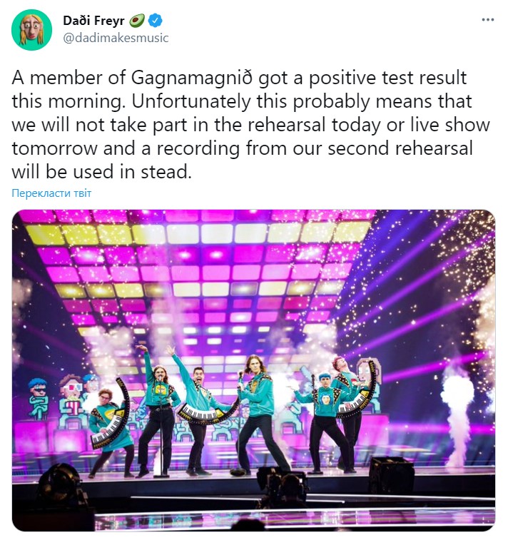 У повідомленні гурту зазначається, що позитивний тест на ковід поки отримав лише один учасник, але, згідно з протоколом та суворими правилам конкурсу в дні пандемії, інших представників Ісландії навряд чи допустять до виступу.