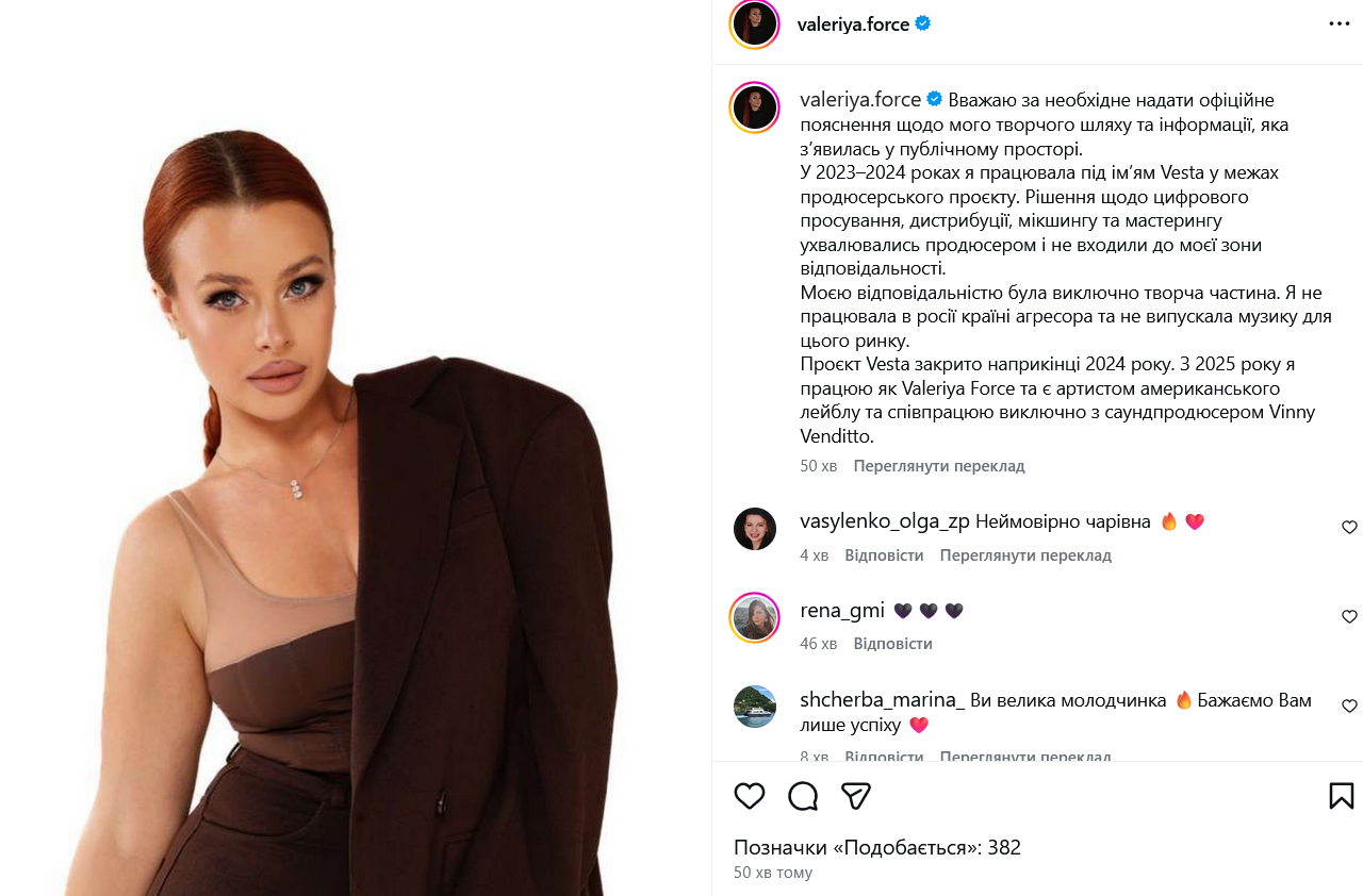 "Проєкт Vesta закрито наприкінці 2024 року. З 2025 року я працюю як Valeriya Force та є артистом американського лейблу та співпрацюю виключно з саундпродюсером Vinny Venditto", - додала вона.