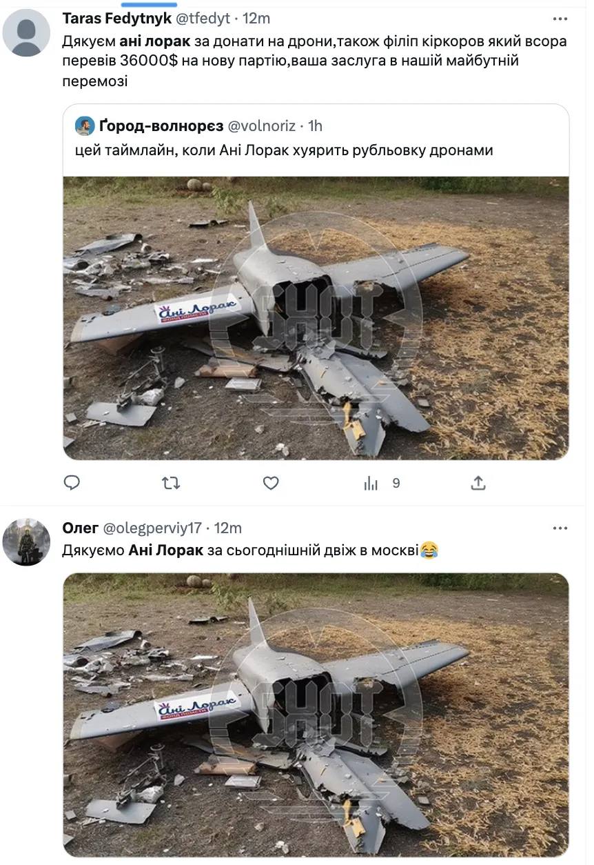 "Фонд помсти Ані Лорак. Якщо це не фото-фейк, то це смішно… Але… (На фото дрон збитий сьогодні під Москвою). Нова війна це і інформаційні баталії. Варіанти, навіщо і кому це потрібно: