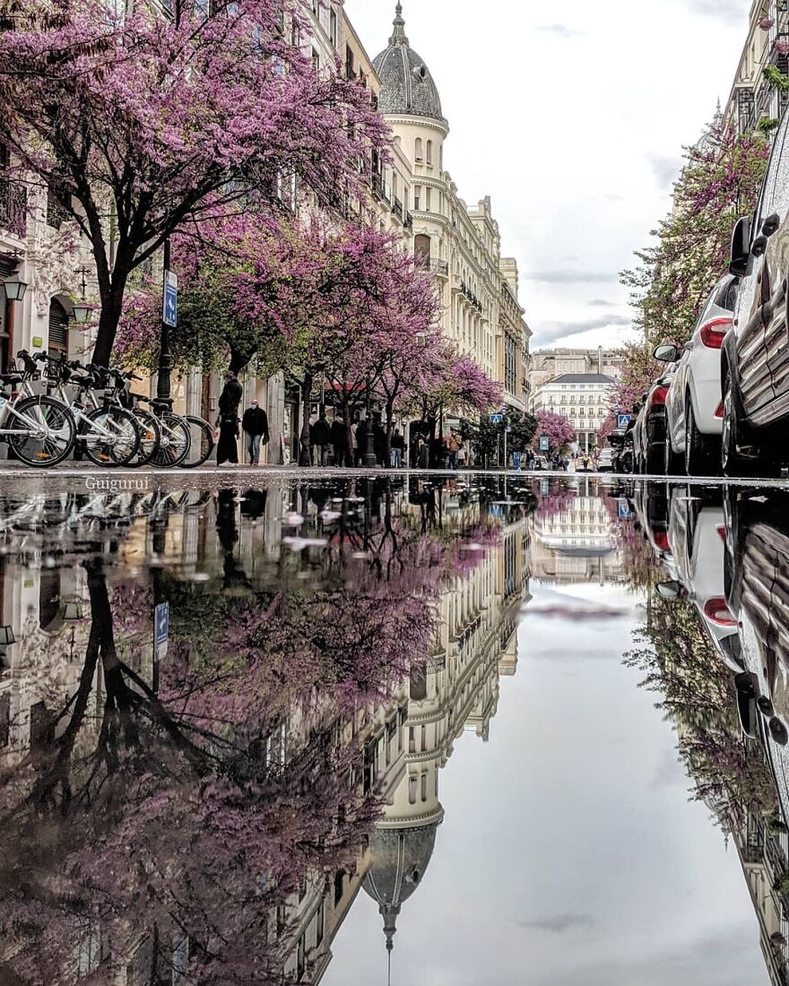 Канадський фотограф Гвідо Гутьєррес Руїс довів, що за допомогою звичайного смартфона та калюжі можна зробити чудовий знімок, який розповідає свою власну історію. Хлопець подорожує світом, і в дощовий день знімає на телефон усю красу міст.