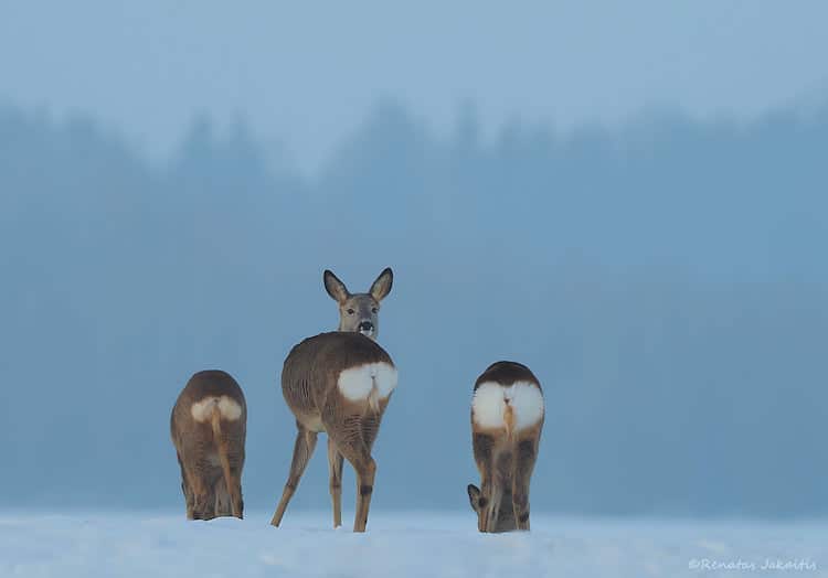 Щоб зробити неймовірний знімок, необхідно опинитися у потрібному місці в потрібний час. Якайтіс ішов за оленями в лісах Литви і по дорозі зустрів цих тварин, які брели по засніженій стежці один за одним. Звук затвора камери змусив оленів повернути голови, і так з'явився цей дивовижний кадр.