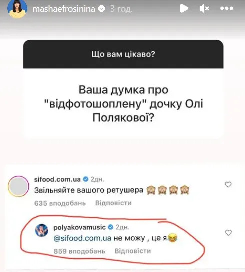"Фотошоп не потрібен!", - наголосила зірка, яка у попередньому дописі зменшила талію доньки і не приховує цього. Коли одна з підписниць порадила Поляковій звільнити свого ретушера, зірка написала: "Не можу, це я", додавши реготливий смайлик.