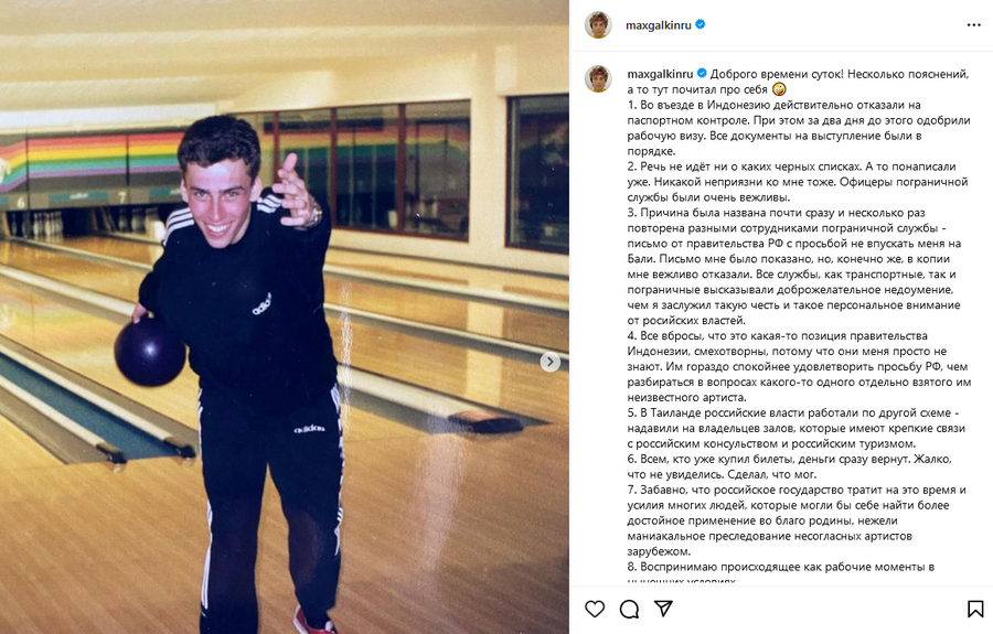 "Не йдеться про жодні чорні списки. А то понаписували вже. Жодної неприязні до мене теж. Офіцери прикордонної служби були дуже ввічливі, - підкреслив Галкін. - Причина була названа майже одразу і кілька разів повторена різними співробітниками прикордонної служби - лист від уряду РФ з проханням не впускати мене на Балі. Лист мені було показано, але, звичайно ж, у копії мені ввічливо відмовили. Усі служби, як транспортні, так і прикордонні, висловлювали доброзичливе здивування, чим я заслужив таку честь і таку персональну увагу від російської влади".