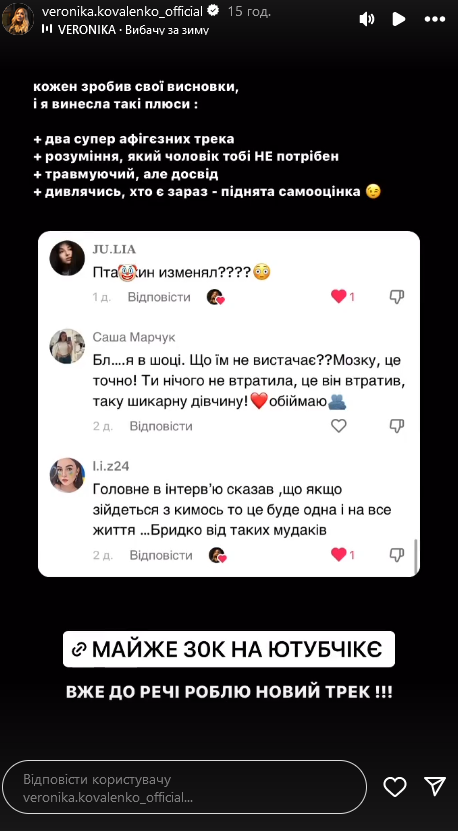 "Коли у мене планувався реліз, ми вже не були разом і розійшлися саме з тієї причини, яку ви всі знаєте. Але я планувала повідомити вам, що ми не пара для того, щоб не обманювати вас", - пояснила дівчина в Instagram та розповіла, які плюси винесла з цих стосунків.