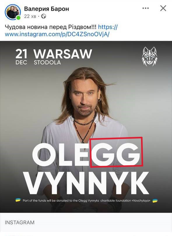 Співак Олег Винник анонсував свій перший концерт після довгої перерви, який відбудеться 21 грудня у Варшаві.