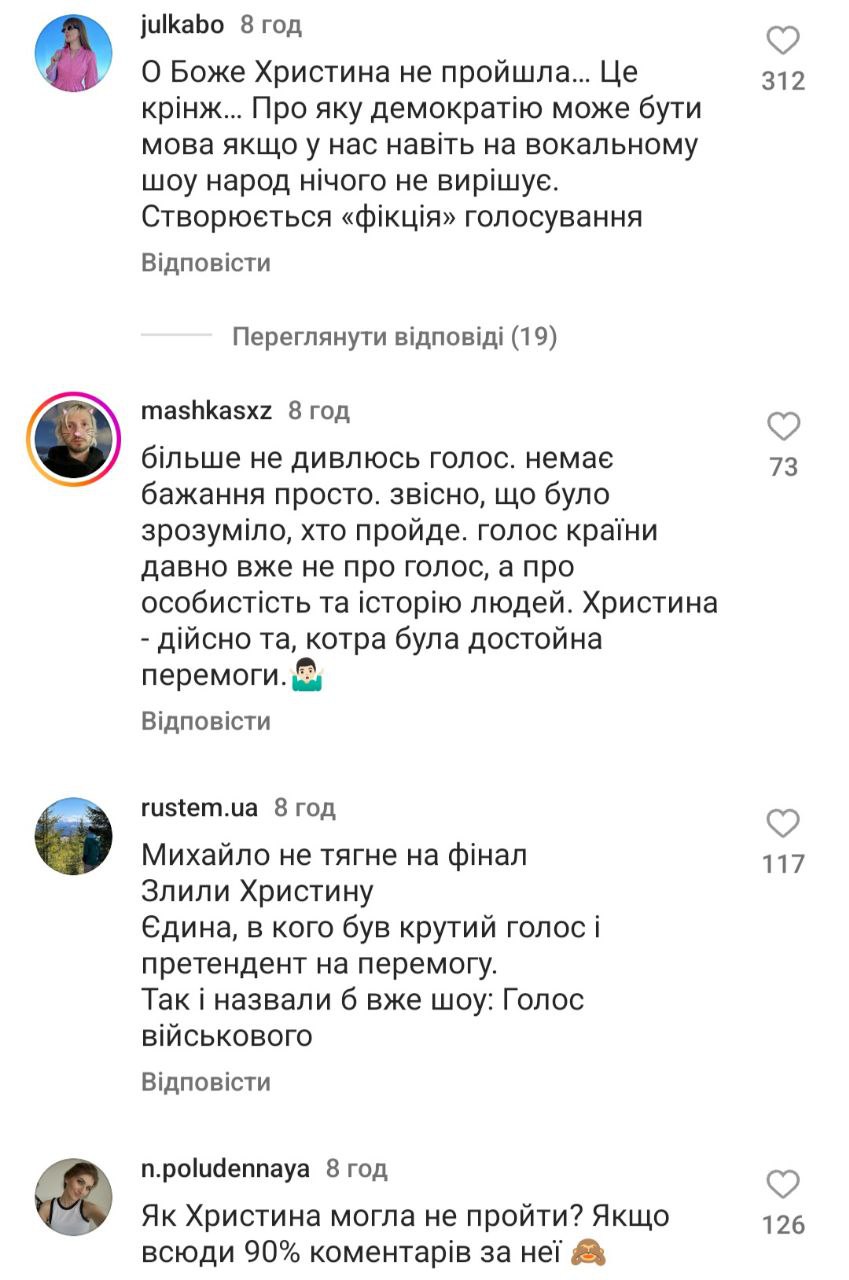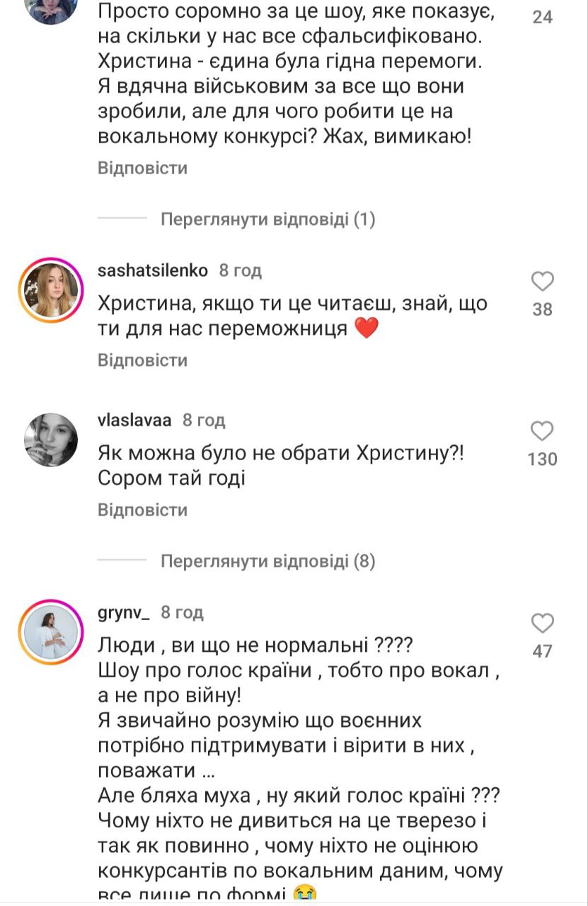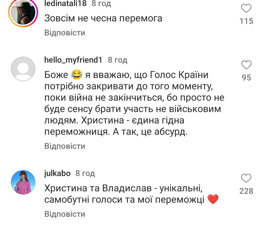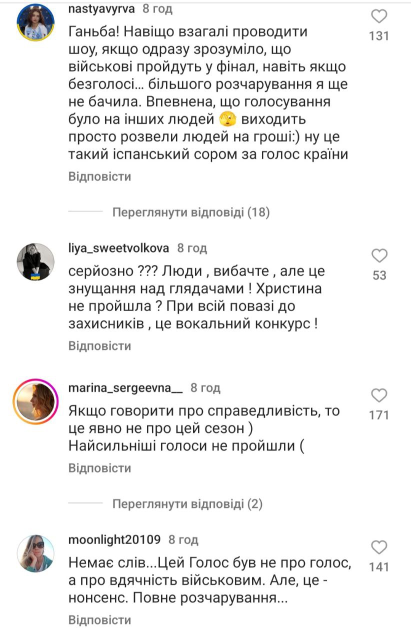 Люди пишуть, що "Голос країни" - це в першу чергу про вокал, а не про учасників, які є соужили чи служать на фронті. "Це був сезон розчарування. Ганьба", "Для чого було це шоу, якщо з самого початку було зрозуміло, хто переможе?", "Сьогодні я вперше повірив, що тут все вирішено наперед", "Я не хейтер, однак точно можу сказати, що були учасники набагато сильніше", - йдеться у деяких коментарях.