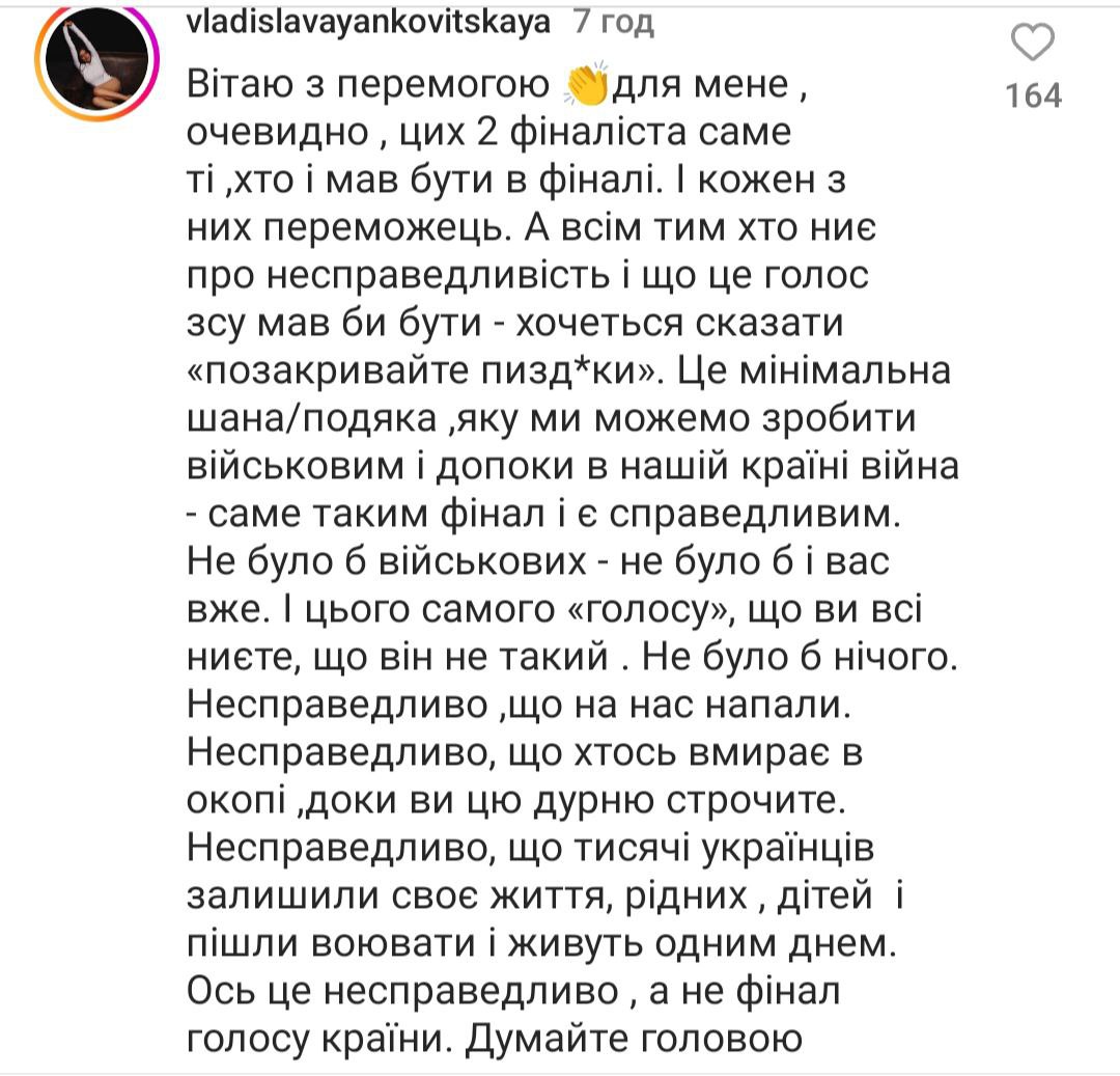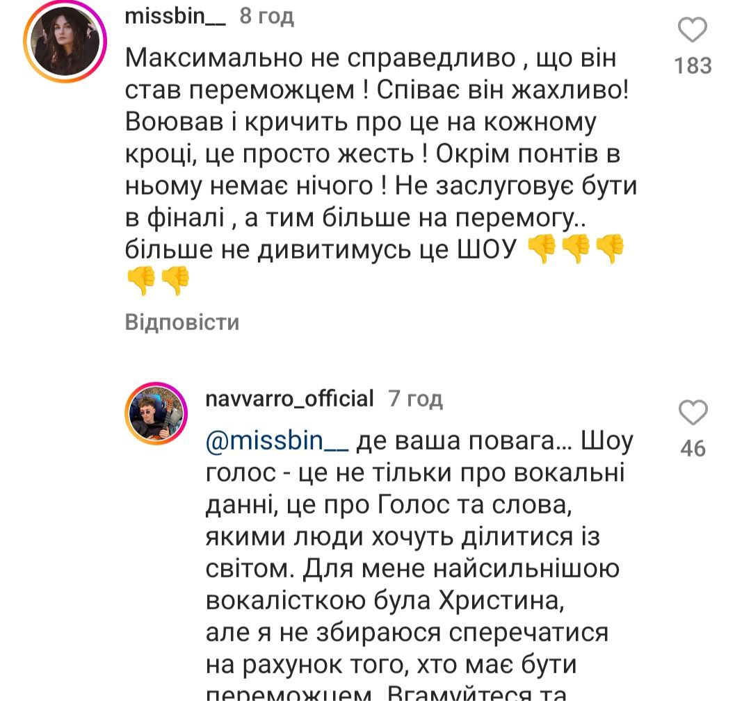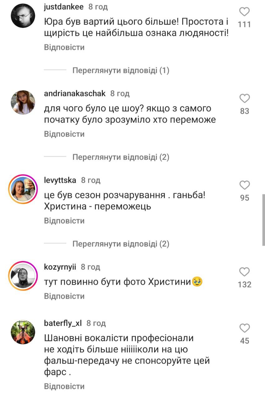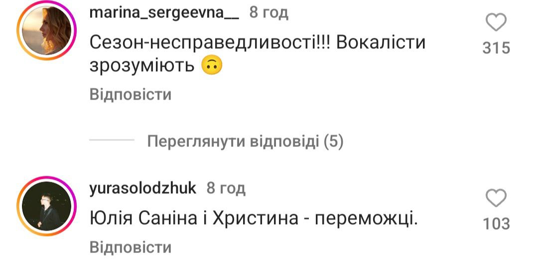 Люди пишуть, що "Голос країни" - це в першу чергу про вокал, а не про учасників, які є соужили чи служать на фронті. "Це був сезон розчарування. Ганьба", "Для чого було це шоу, якщо з самого початку було зрозуміло, хто переможе?", "Сьогодні я вперше повірив, що тут все вирішено наперед", "Я не хейтер, однак точно можу сказати, що були учасники набагато сильніше", - йдеться у деяких коментарях.