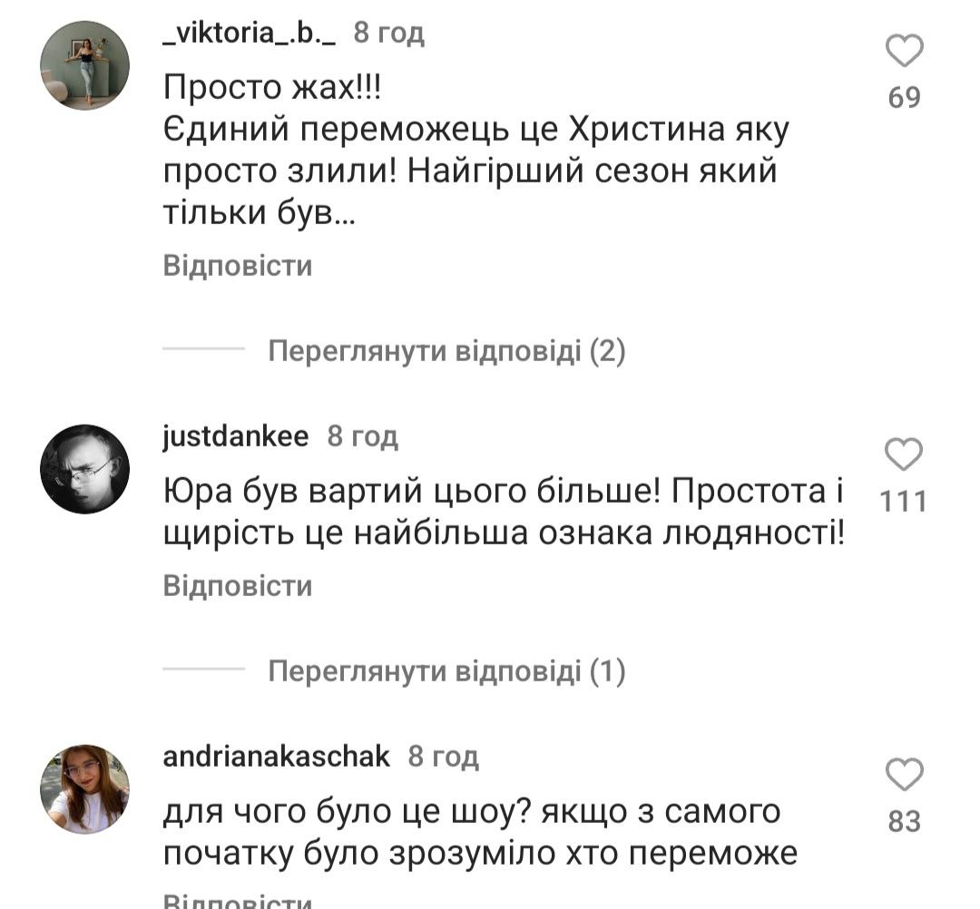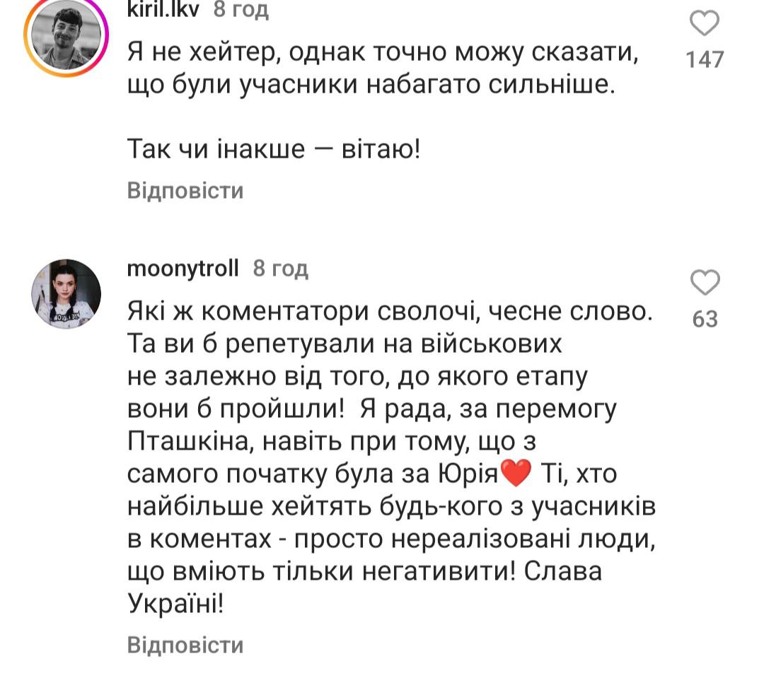 Зокрема, на Instagram сторінці шоу користувачі мережі висловили свою думку з цього приводу. У коментарях під постом, в якому вказано ім'я переможця, чимало юзерів зазначили, що Михайло Панчишин, а також інший учасник Юрій Городецький потрапили до фіналу лише завдяки тому, що є військовими ЗСУ.