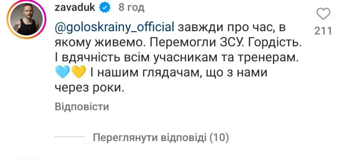 Перемогу Михайла Панчишина прокоментував продюсер вокального шоу Володимир Завадюк. У коментарі під постом він написав, що "Голос" - це завжди про час, у якому нині живуть українці. "Перемогли ЗСУ. Гордість. І вдячність всім учасникам та тренерам. І нашим глядачам, що з нами через роки".