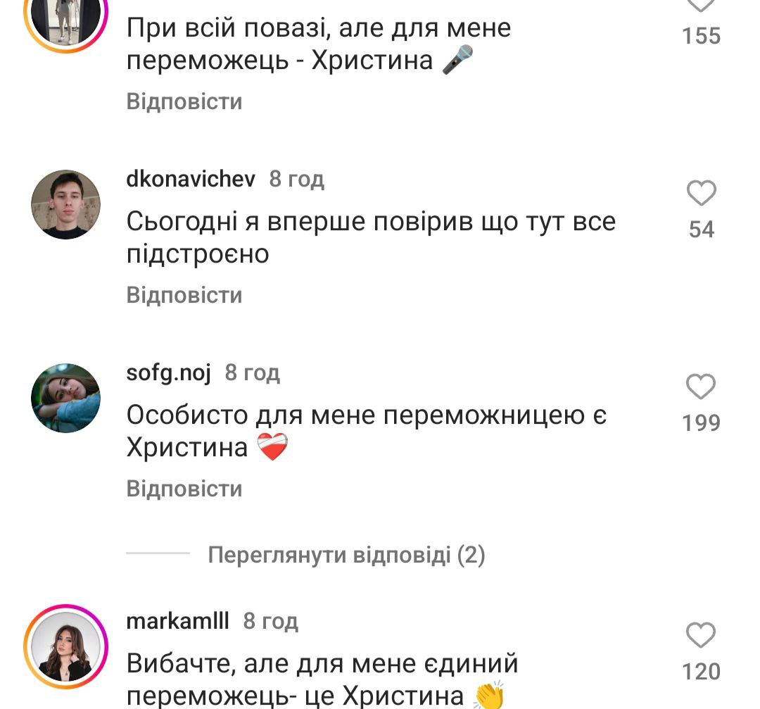 Інші пишуть, що переможницею у "Голосі країни-13" для них стала Христина Старикова із команди Юлії Саніної. Нагадаємо, вона виступила у фіналі із піснею нідерландського виконавця Дункана Лоуренса "Arcade", який став переможцем "Євробачення-2019".