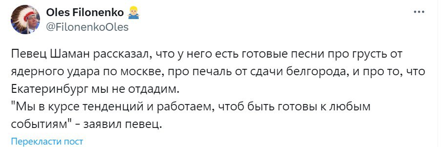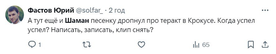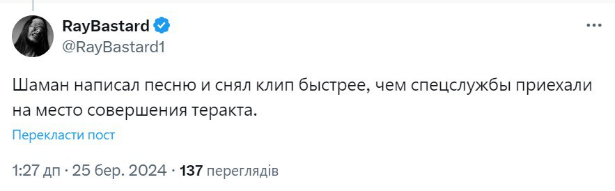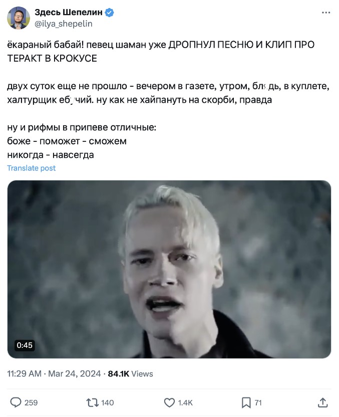 "Співак Шаман вже дропнув пісню і кліп про теракт у "Крокусі". Дві доби ще не минуло – ввечері в газеті, вранці, бл*ть, в куплеті, халтурник еб*чий. Ну як не хайпанути на скорботі, правда. Ну і рими в приспіві відмінні: боже – поможет – сможем, никогда – навсегда".