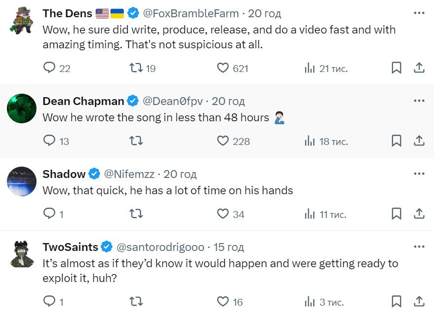 Іноземці теж не приховують свого здивування і висловлюють наступні думки: "Вау, ну звісно ж він написав, записав, випустив і зняв відео так швидко. Зовсім не підозріло". "Ого, він записав пісню менше ніж за 48 годин". "Здається, що вони знали, що станеться, і готувалися, щоб це використати".
