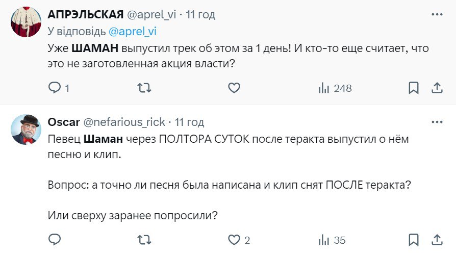 Тим часом людей у коментарях дивує не те, що артист-путініст вирішив похайпувати на темі теракту, а те, як швидко вийшли пісня і відео: робота була випущена менше ніж за 48 годин після подій. Навіть росіяни припускають, що це все "було підготовлено завчасно". Ось деякі коментарі на цю тему: