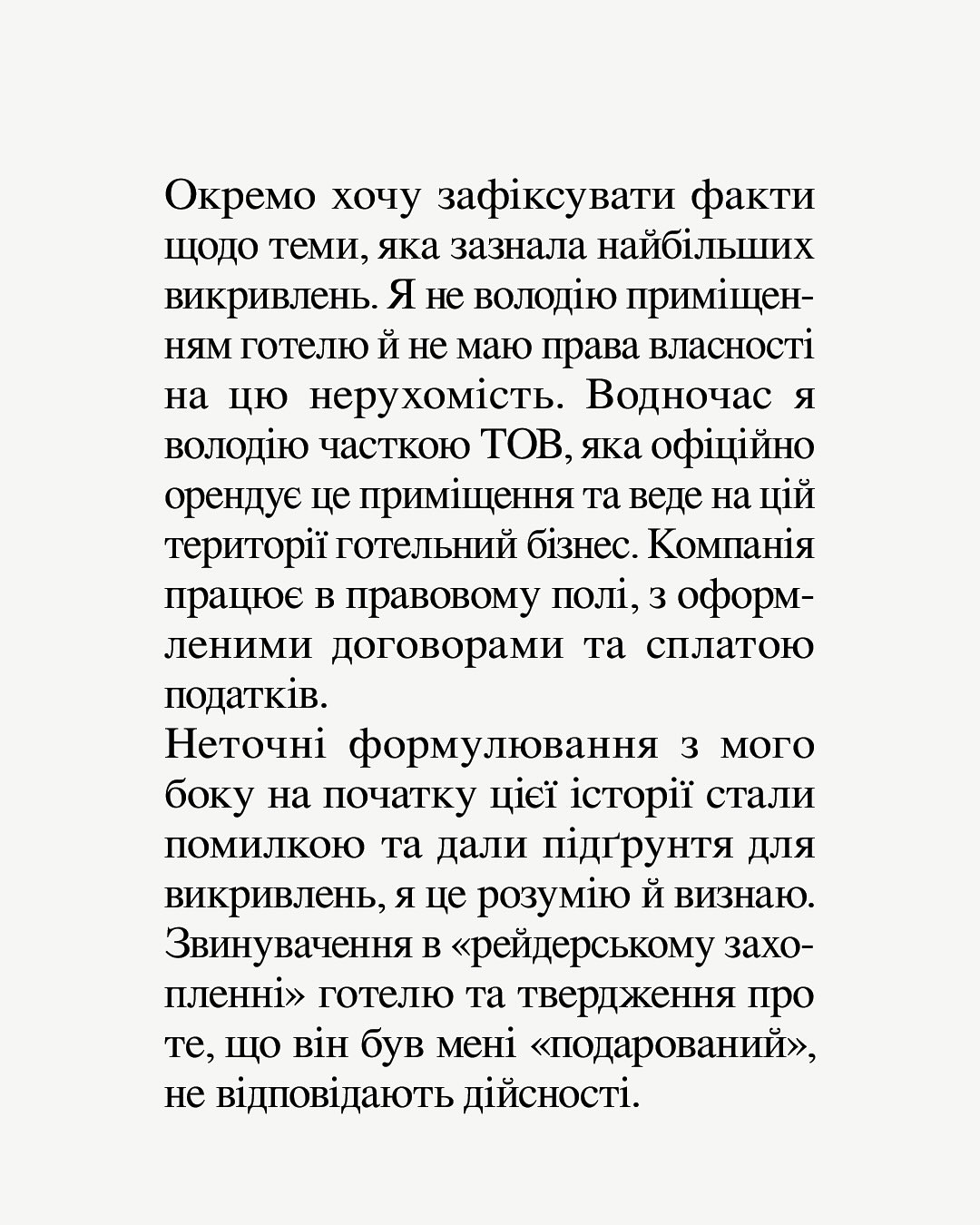 Звинувачення у "рейдерському захопленні" готелю та чутки про те, що нерухомість була отримана у подарунок, GRISANA назвала неправдивими.