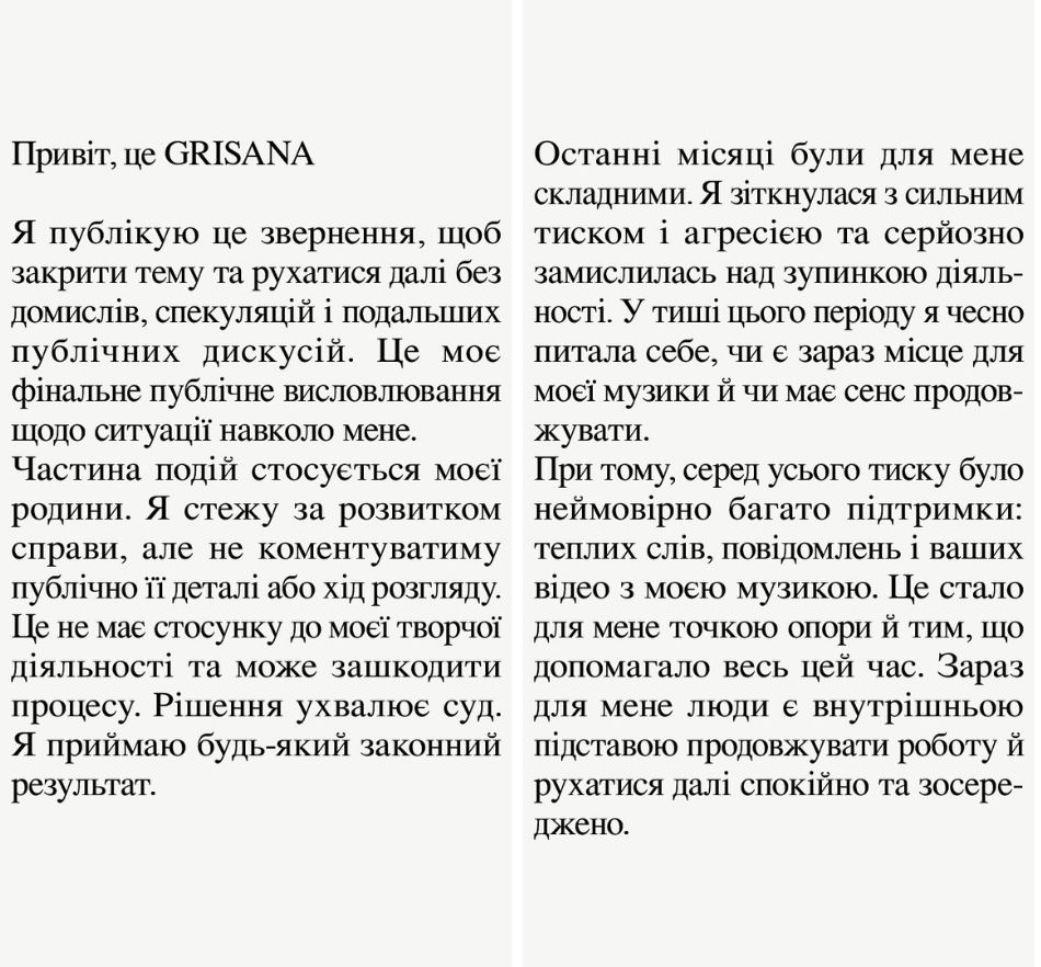 "Привіт, це GRISANA. Я публікую це звернення, щоб закрити тему та рухатися далі без домислів, спекуляцій і подальших публічних дискусій. Це моє фінальне публічне висловлювання щодо ситуації навколо мене", - написала співачка.