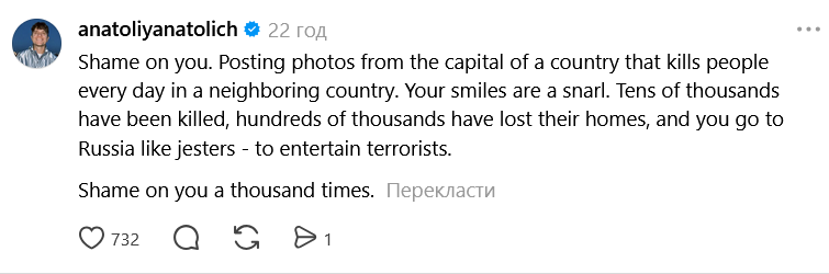 "Ганьба вам. Ви публікуєте фотографії зі столиці країни, яка щодня вбиває людей у сусідній країні. Ваші посмішки - це гримаси. Десятки тисяч людей загинули, сотні тисяч втратили свої домівки, а ви їдете до Росії, як блазні, - розважати терористів. Тисячу разів ганьба вам".