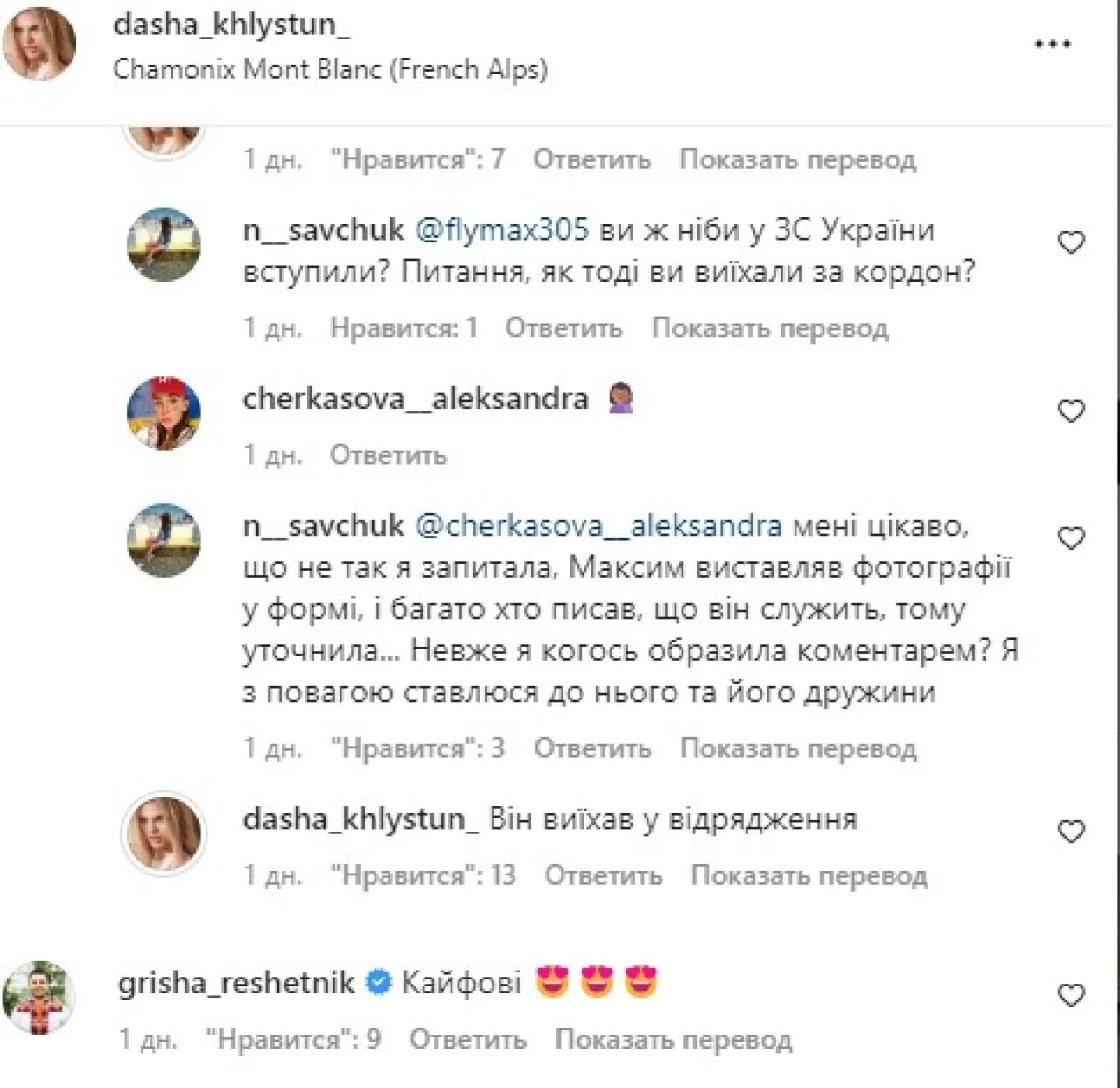 У багатьох підписників постало питання: як Михайлюк виїхав з України, якщо зовсім недавно виставляв фото у формі? У коментарях Хлистун не стала підтверджувати чи спростовувати, чи служить її чоловік у ЗСУ, але сказала, що він "виїхав у відрядження".