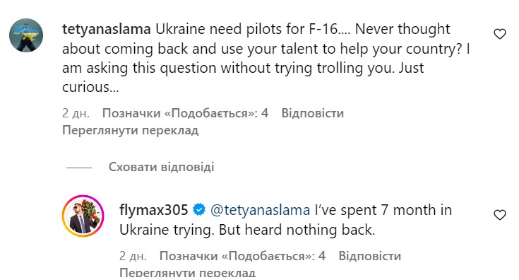 "Україні потрібні пілоти F-16... Ніколи не думали повернутися назад і використати свій талант, щоб допомогти країні? Я питаю без спроби вас зачепити, просто цікаво", - звернулася до нього підписниця.