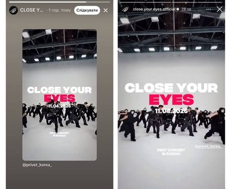 Південнокорейський кейпоп-гурт Close Your Eyes анонсував концерт у Москві, який має відбутися 11 квітня у залі VK Stadium. Про це повідомило Суспільне Культура.
