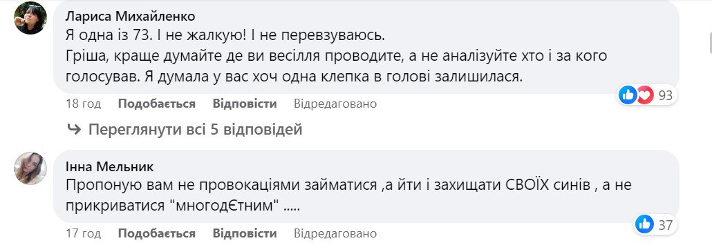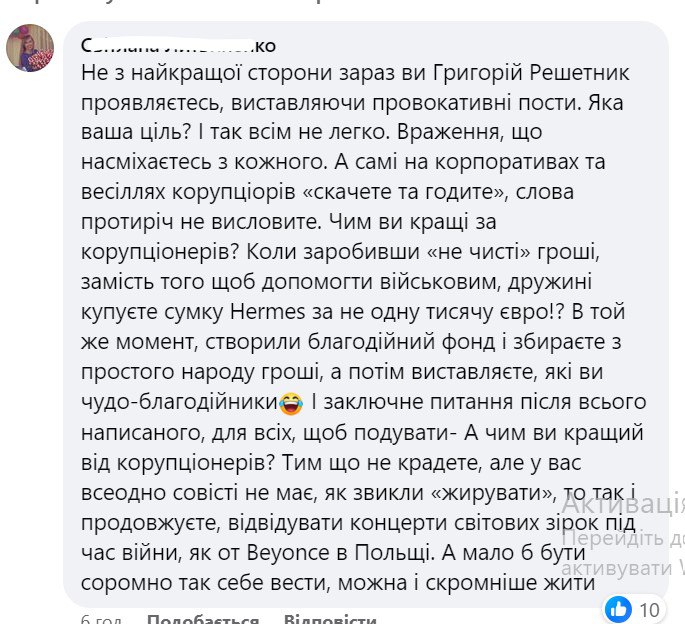 "Не з найкращої сторони зараз ви проявляєтесь, виставляючи провокативні пости. Яка ціль? І так всім нелегко. Враження, що насміхаєтесь з кожного, а самі на корпоративах та весіллях корупціонерів "скачете та годите", слова протиріч не висловите".