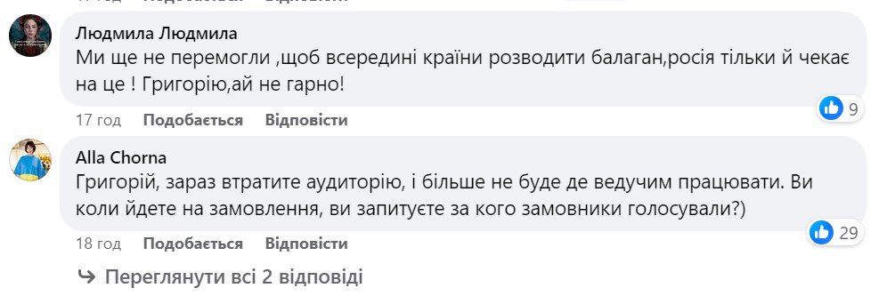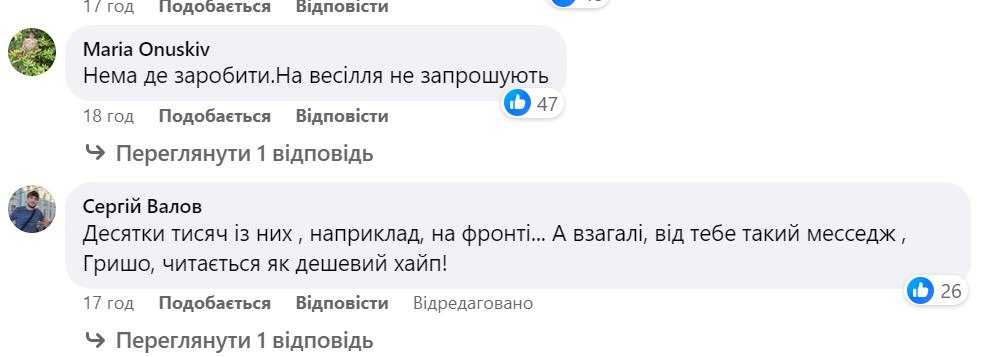 "Зараз втратите аудиторію і більше не будете ведучим працювати", "Ви коли йдете на замовлення, ви запитуєте за кого замовники голосували?", "Нема де заробити, на весілля не запрошують", "Від тебе такий меседж, Гришо, читається як дешевий хайп"