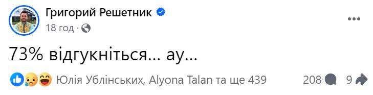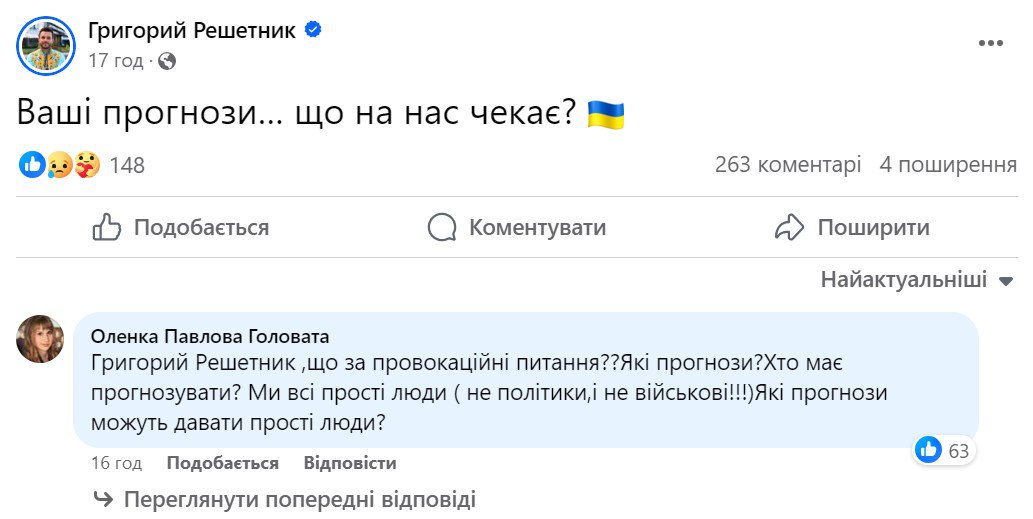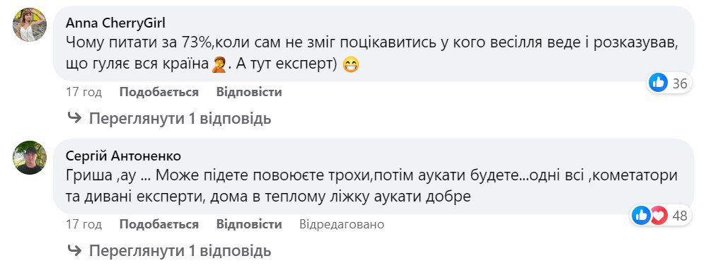 У коментарях люди не стали зволікати з відповіддю та висловили свою думку. Зокрема, чимало з них написали про те, що недоречно робити подібні пости з його боку, оскільки мало хто є військовим експертом і може щось прогнозувати. Питання від ведучого деякі користувачі назвали "провокаційними". Також були і ті хто, підтвердив що є "одним чи однією із 73%, і не жалкує про свій вибір".