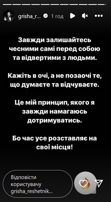 "Завжди залишайтесь чесними самі перед собою та відвертими з людьми. Кажіть в очі, а не позаочі те, що думаєте та відчуваєте. Це мій принцип, якого я завжди намагаюсь дотримуватись. Бо час усе розставляє на свої місця", - підсумував ведучий.