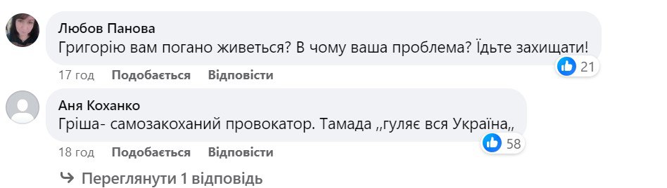 "Гуляє вся Україна. А мій брат лишився інвалідом без виплат, без протезу. Бо такі виродки з якими ви гуляєте всією країною не можуть нажертися грошей. І щоб хоч щось добитися треба судитися. А ви гуляйте", "Гуляти буде вся Україна? Чи тільки центральна?", "На передову, щоб відчув, як гуляє вся Україна", - йшлося у коментарях.