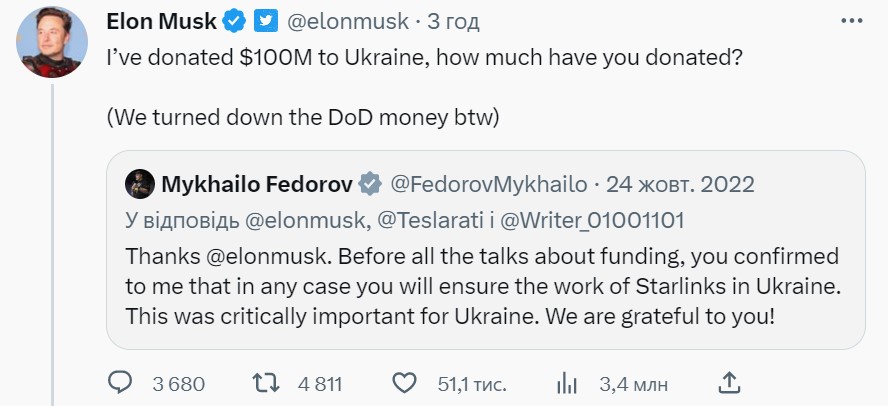 "Я пожертвував Україні 100 млн. доларів, а скільки ви пожертвували?" - відповів бізнесмен, доклавши до свого повідомлення твіт Михайла Федорова з вдячністю за фінансування Starlink.