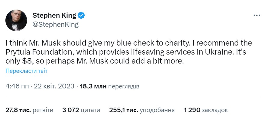 "Думаю, містер Маск має віддати мою синю галочку на благодійність. Я рекомендую Фонд Притули, який надає послуги з порятунку життів в Україні. Це всього 8 доларів, тож, можливо, містер Маск міг би додати трохи більше", - написав Кінг.