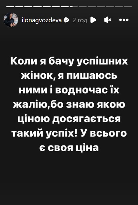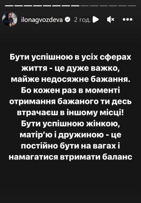 "Багато хто з вас бачить лише яскраву картинку в соцмережах, великі проекти, роботу, успіх, визнання. У всього цього є інша сторона – постійні жертви, постійний вибір між сім"єю та роботою. Весь час потрібно ці складові життя переставляти між собою, щоб розуміти, що ти всюди встигла".