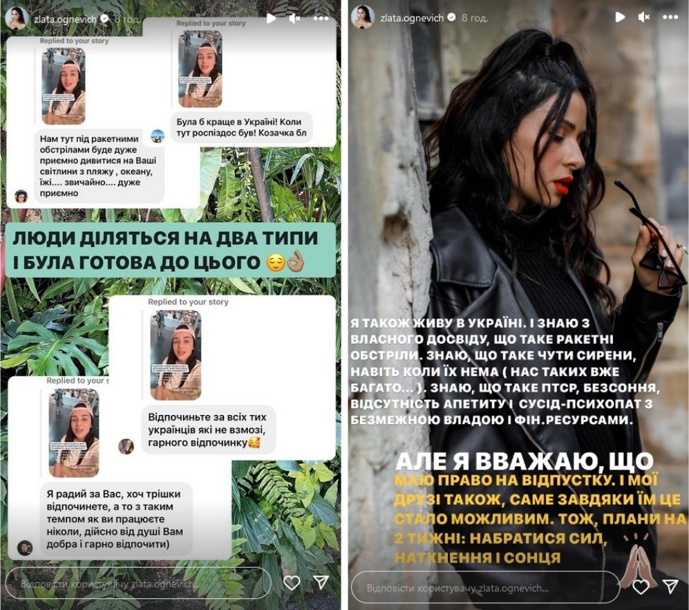 "Нам тут під ракетними обстрілами буде дуже приємно дивитися на ваші фотографії з пляжу, океану, їжі ... звичайно ... дуже приємно", - саркастично написала Златі одна з підписниць.