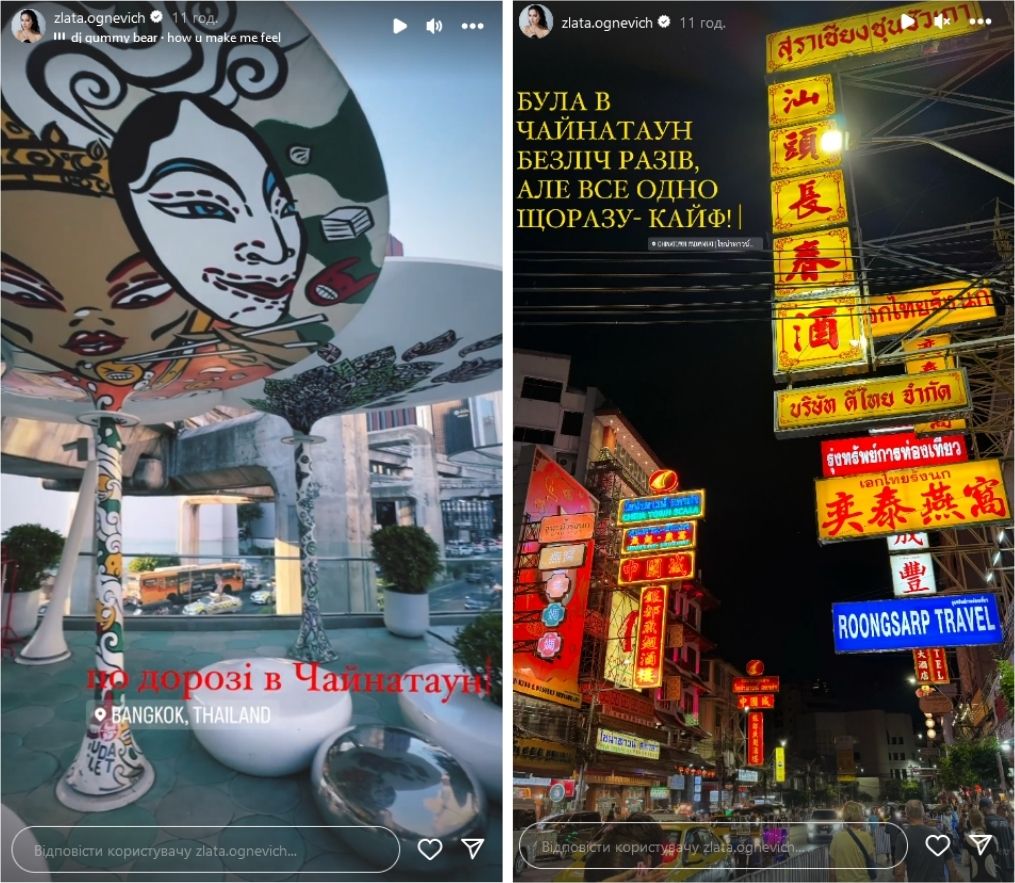 У Бангкоку співачка відвідала Чайнатаун - один з найдавніших та найяскравіших районів міста, який є улюбленим місцем туристів. "Була в Чайнтауні безліч разів, але все одно щоразу - кайф", - зізналася співачка.