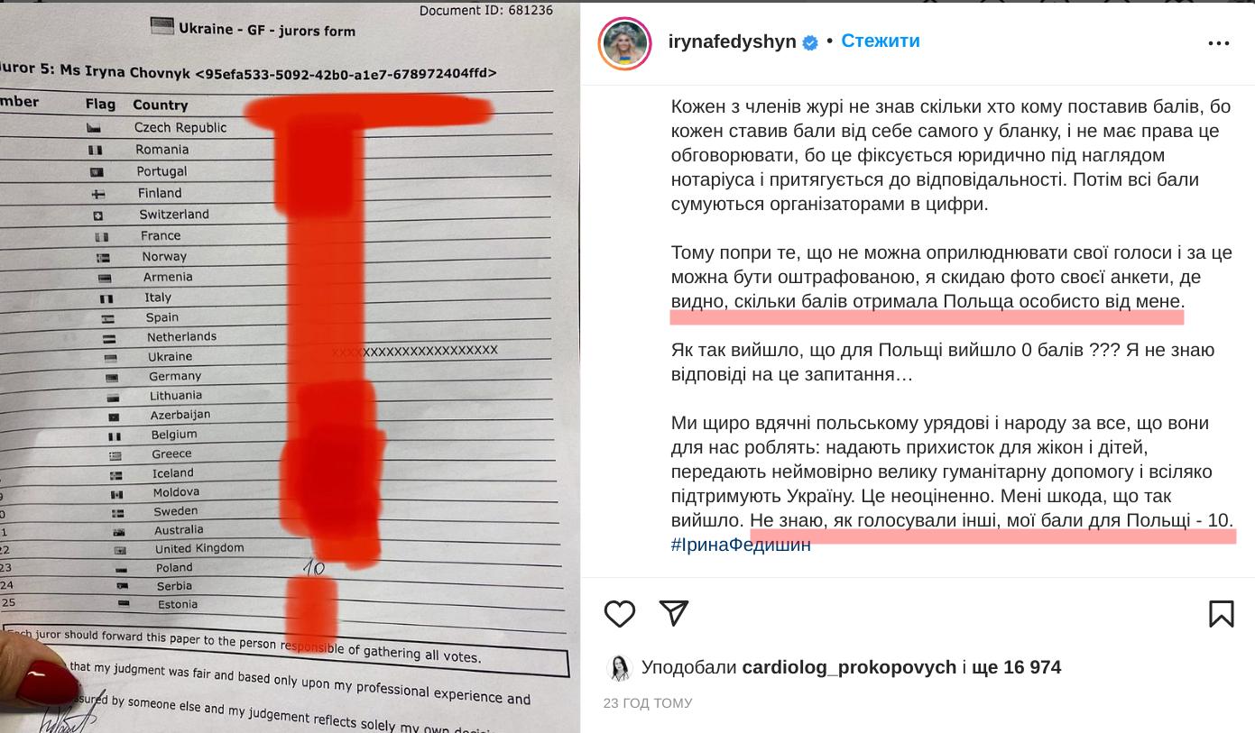 "Всі члени журі перебували в одній кімнаті. Перед нашими очима був договір, де жирними чорними літерами було написано: не дискримінуйте нікого за національність, стать, зовнішність, політичні переконання чи інші причини, не пов'язані з виступом чи піснею. З нами у кімнаті був представник нотаріуса, який спостерігав, щоб усі правила були дотримані, - пише Федишин. - Якщо цей конкурс настільки важливий політично, чому тоді оргкомітет давав нам такий посил? Чому навіть після того, коли наші протоколи з голосуванням забрали і побачили, що виходить така ситуація, щоб уникнути такого політичного скандалу, не підкоригували разом із нами ці голоси? Чому не підказали і не допомогли розібратися в ситуації?У сі хто там знаходилися - це українці. Хіба ми зрадники своєї країни? Але зараз у всьому винні журі, а всі решта ні при чому?"