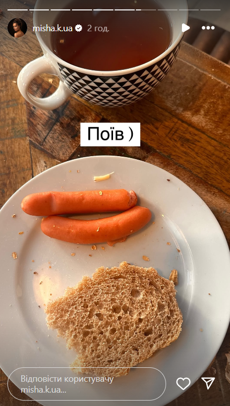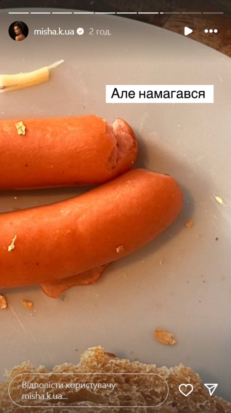"Поїв, - вказує акторка. На тарілці можна й досі помітити практично цілий сніданок. - Але намагався".