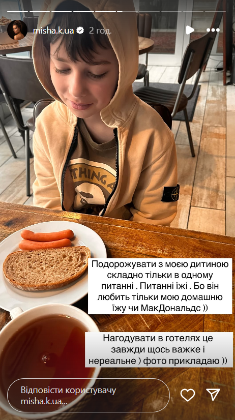 "Подорожуючи з моєю дитиною складно тільки в одному питанні. Питанні їжі. Бо він любить тільки мою домашню їжу чи МакДональдс. Нагодувати в готелях це завжди щось вадке і нереальне".