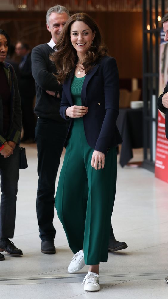 У повсякденному житті герцогиня Кембриджська не боїться слідувати останнім віянням моди. Так, під трикотажний комбінезон з піджаком вона одягла зручні кросівки.