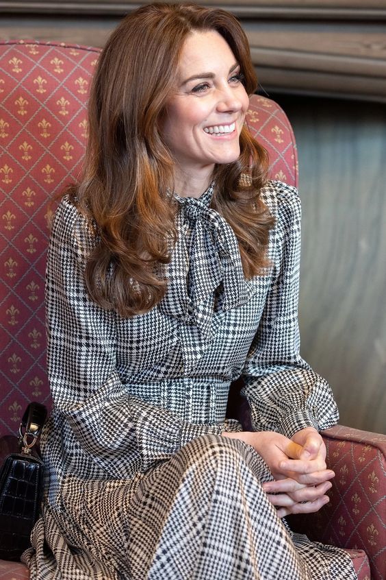 Ще одним варіантом повсякденного лука може бути сукня з довгими рукавами з принтом "гусяча лапка". Відзначимо, що однією з улюблених модних деталей Кейт Міддлтон є бант на сукні або блузі.
