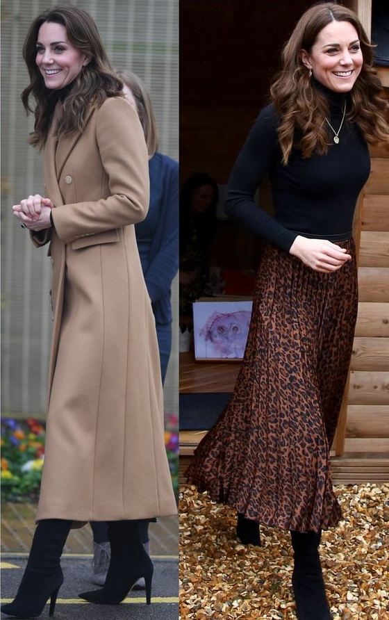 Не менш ефектно виглядає на герцогині Кембриджській спідниця міді з анімалістичні принтом, темна водолазка і бежеве пальто, яке завжди буде в тренді.