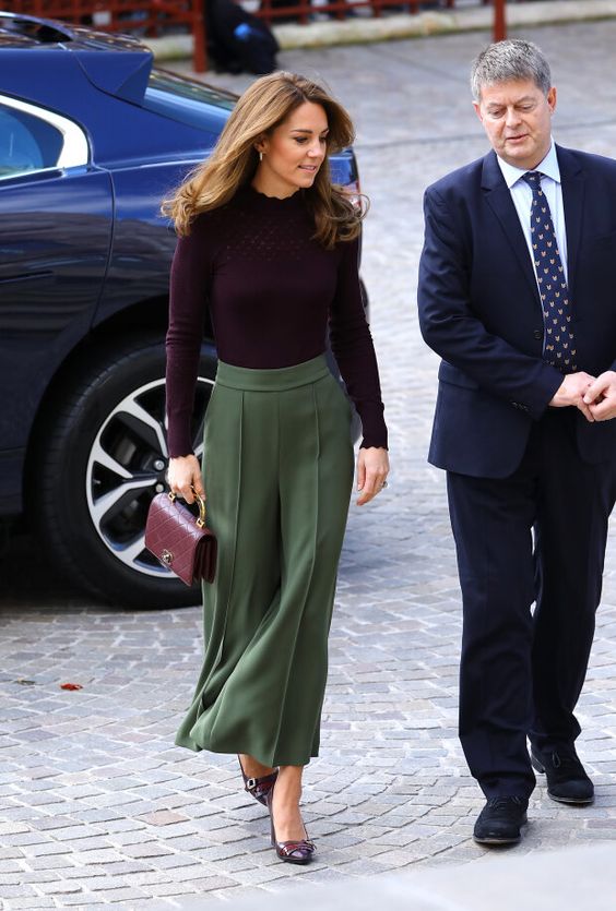 Одним з найпростіших, але в той же час стильним буде образ з широкими брюками. Кейт Міддлтон, слідуючи модним трендам, вибирає як класичну довгу модель, так і укорочені брюки-кюлоти. Доповнити образ можна або лаконічною водолазкою, або яскравою блузкою, а також сумкою.