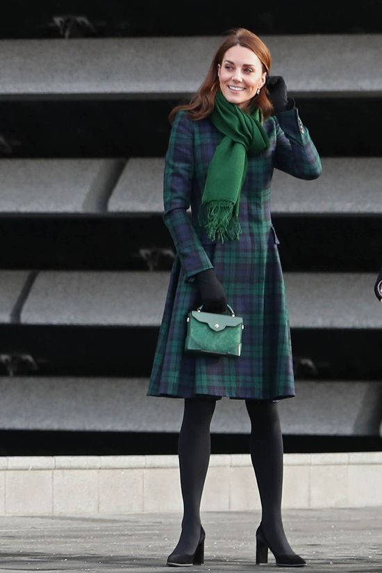 Кейт Міддлтон, як справжня британка, часто віддає перевагу класиці - речам з шотландської клітинкою. Цей образ герцогиня доповнила масивним шарфом і маленькою сумочкою.