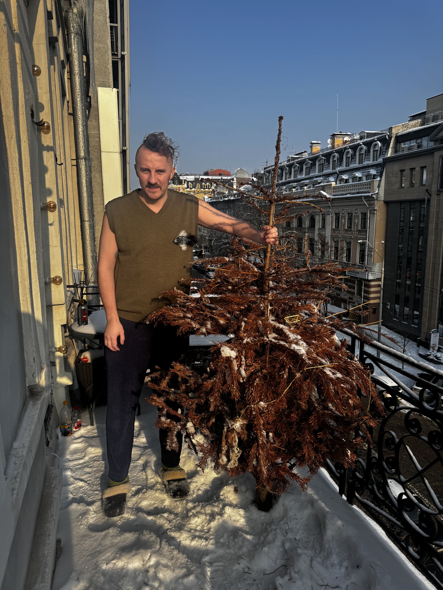 "Цю ялинку я купив на святкування нового 2022 року і вона, як і вся країна, незламно стоїть вже 4 рік", - зізнався Євген.