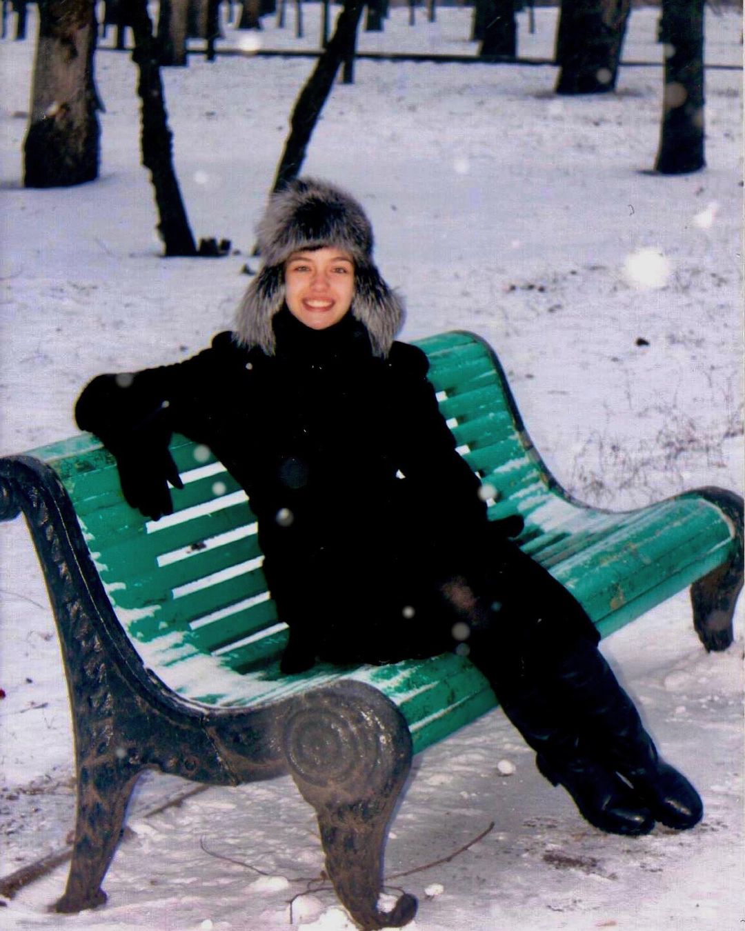 На опублікованому в Instagram фото дружина мандрівника зображена у рідному місті - Дніпрі. На знімку майбутня королева краси позує у засніженому парку. 17-річна школярка у пальті та шапці-вушанці сидить на лавочці та широко посміхається.