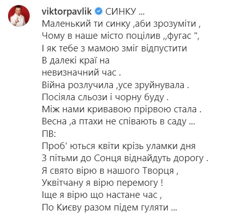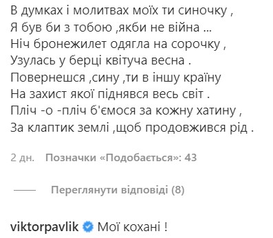 Тим часом Віктор Павлік відреагував на щасливі фото дружини із маленьким сином віршем, який він опублікував у коментарях під публікацією. "Мої кохані", - також написав артист у наступному коментарі.