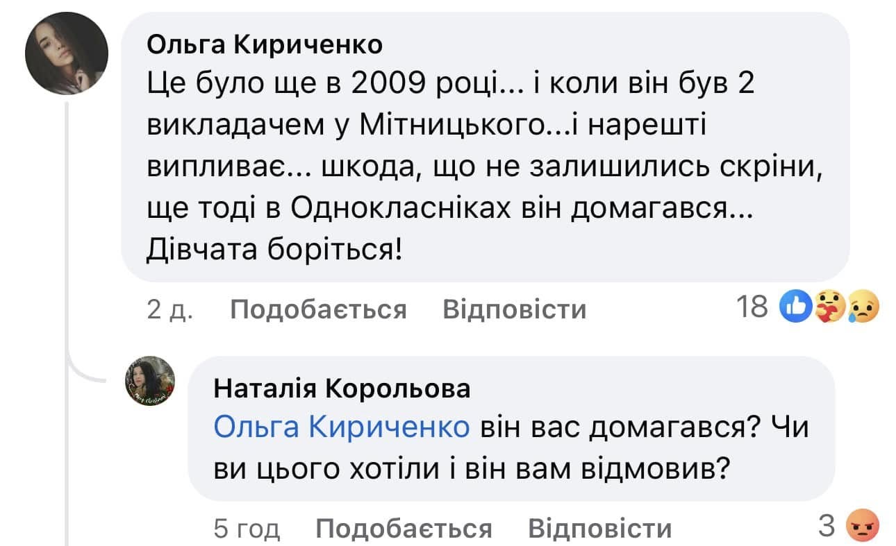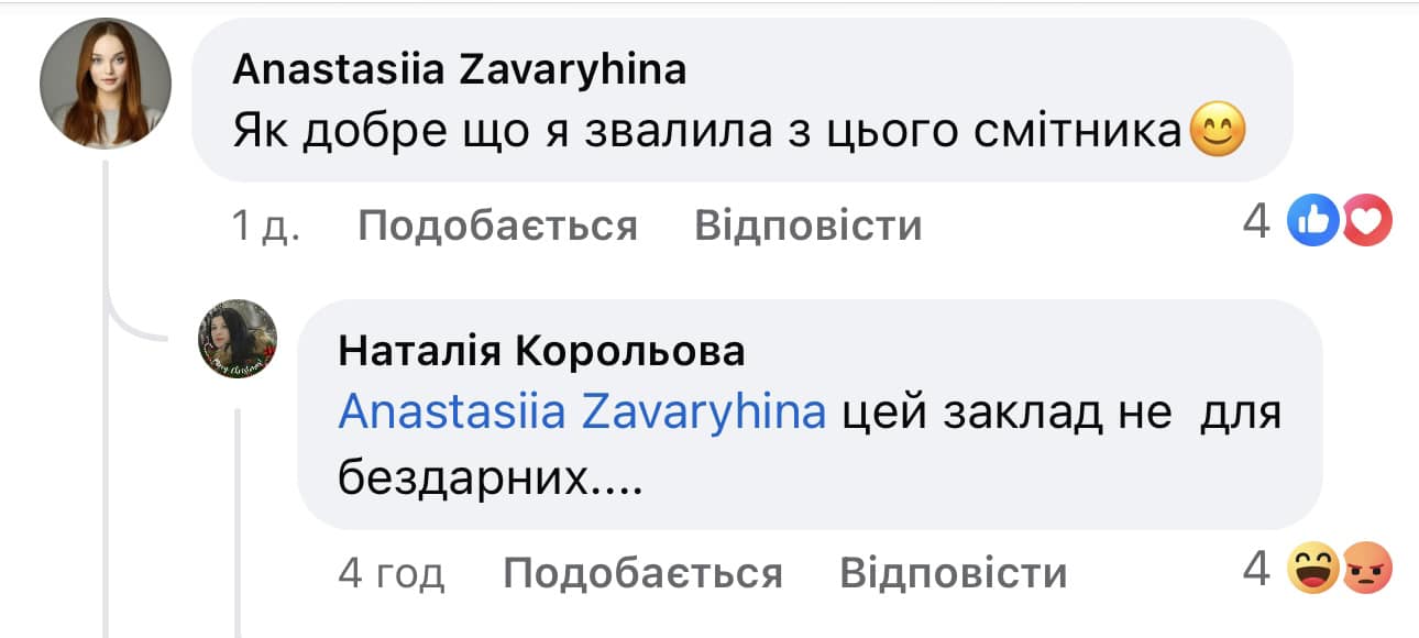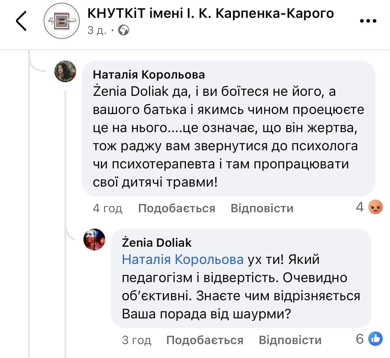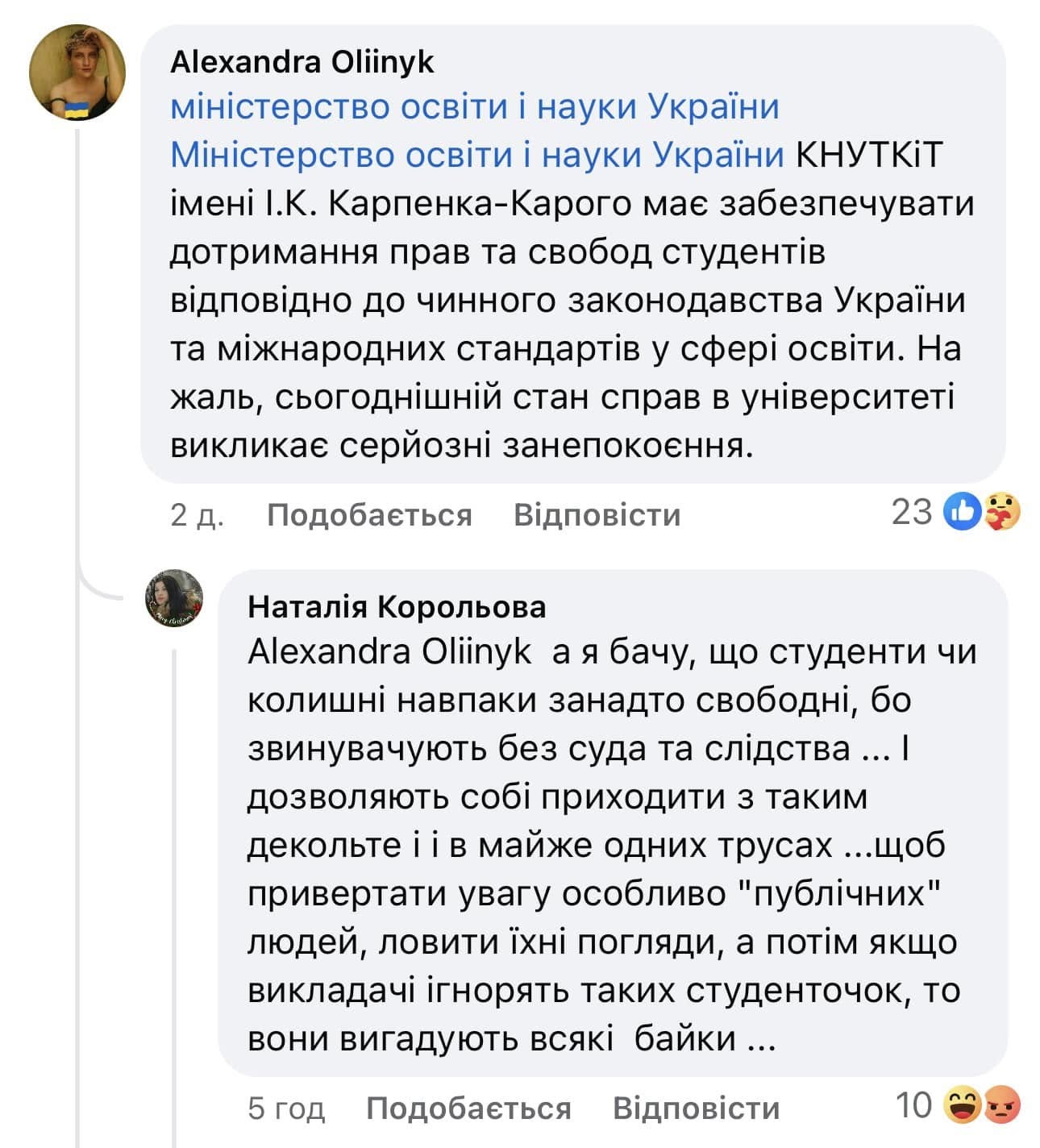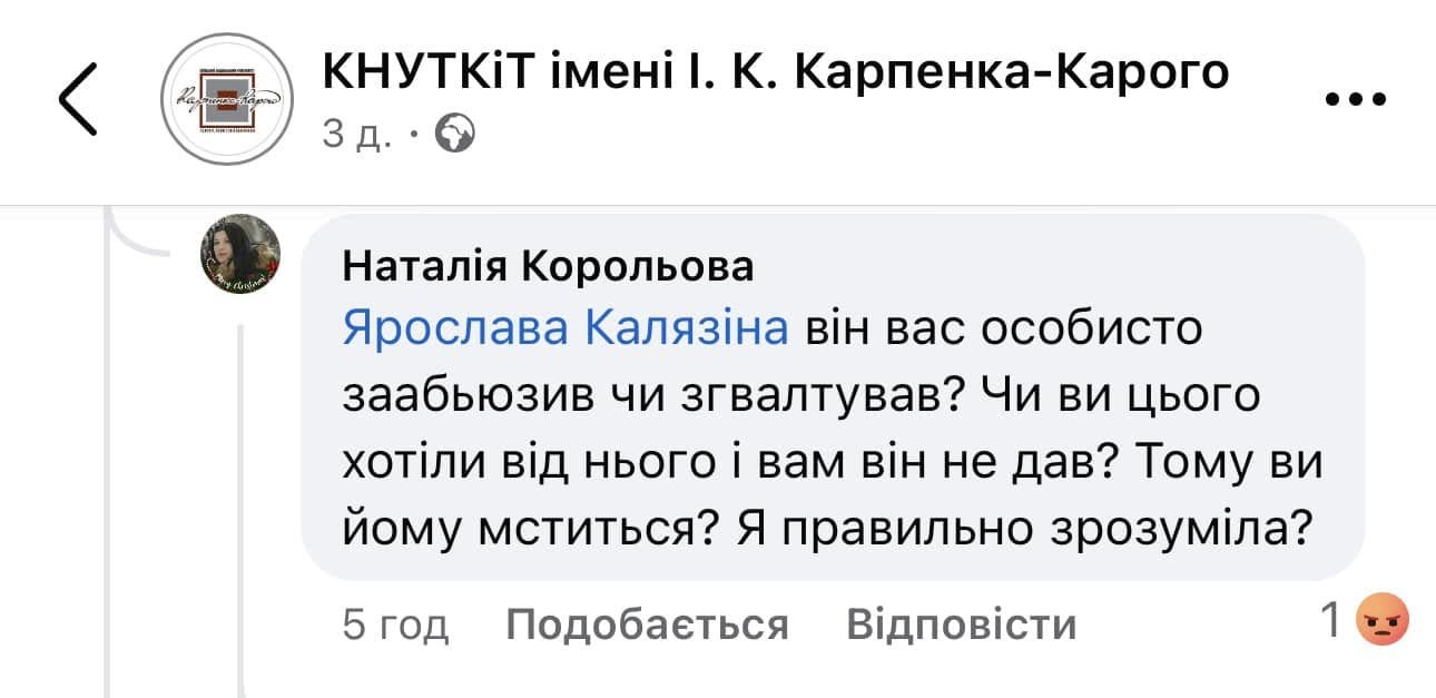 "Пані Наталя, здається, серйозно палить контору. Під одним із дописів студенти та студентки масово почали розповідати про жах, який твориться в Карпенка-Карого. Коментар написала і мама однієї зі студенток, яка мусила забрати доньку із закладу. Дописи пишуть викладачі і підтверджують гидку поведінку колег", - зазначила Чіченіна.