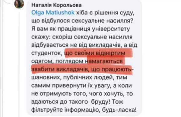 Журналістка Лєна Чіченина назвала порталом в пекло коментарі Наталії Корольової, завідувачки навчальної лабораторії університету імені Карпенка-Карого, яка стала на захист фігуранта секс-скандалу Андрія Білоуса - викладача університету та режисера Молодого театру.