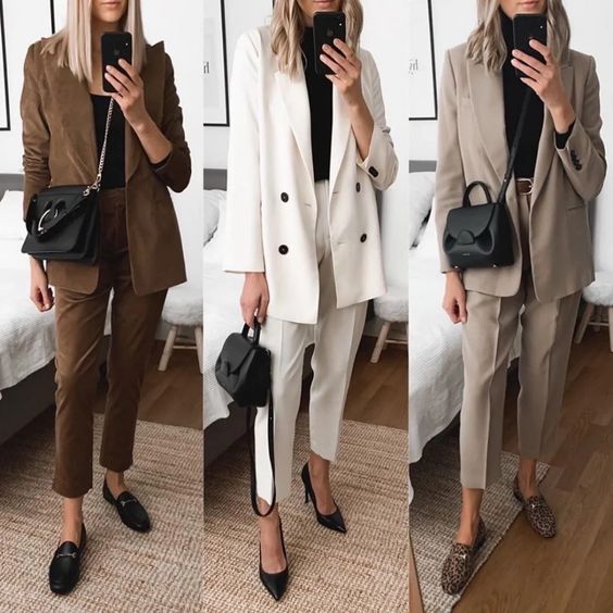Невід'ємна класика - брючний костюм бежевого кольору з масивним піджаком, або як його ще називають оверсайз, стане чудовим варіантом для ділової зустрічі або роботи в офісі. Особливо стильно в цьому сезоні виглядають штани із завищеною талією, під які можна одягти як легкий топ, так і водолазку. Доповнити образ можна як елегантними човниками, так і лоферами на низькому ходу.