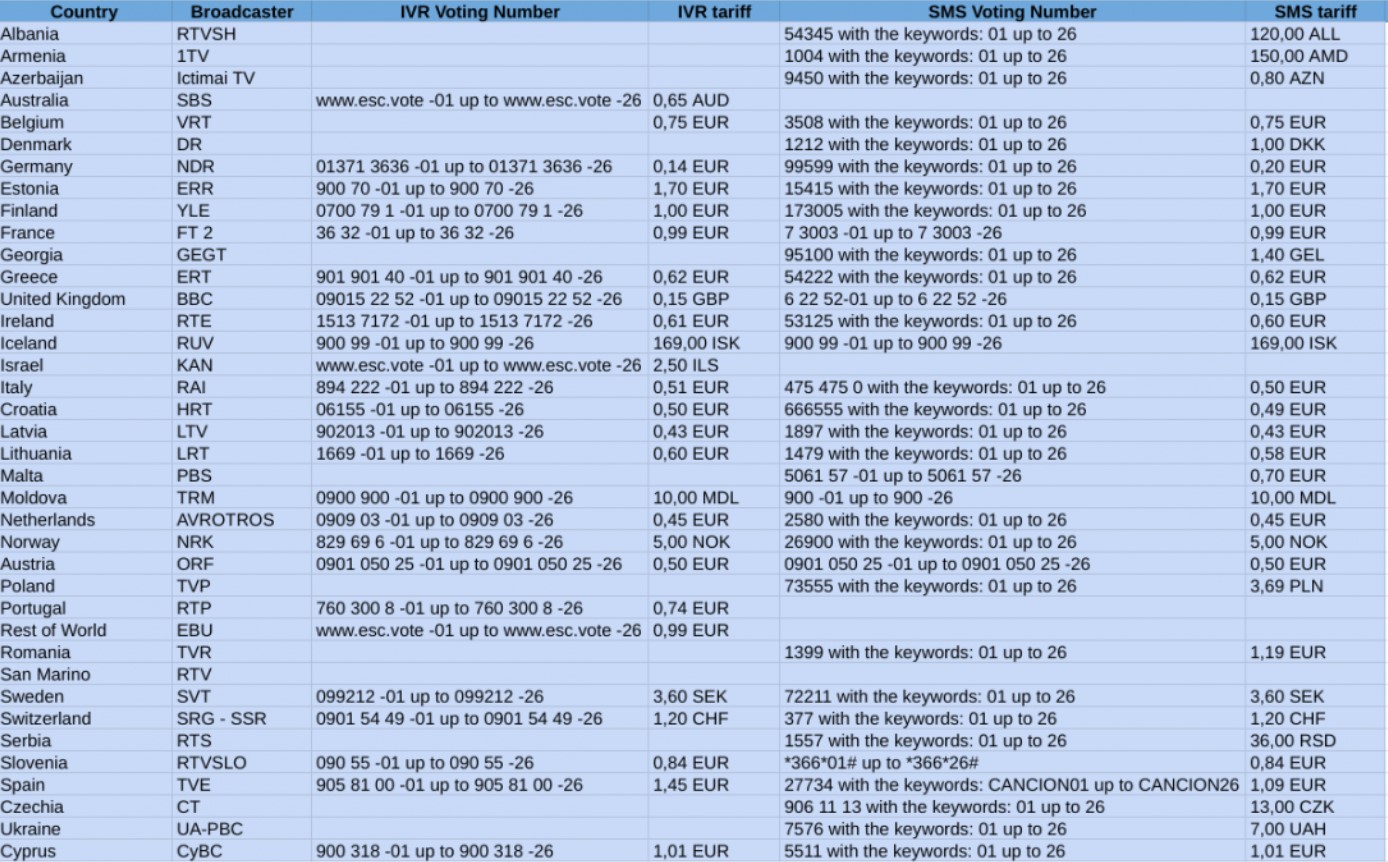 На скриншоті нижче ви можете побачити номери для SMS-голосування у кожній із країн-учасниць. В останній колонці знайдете вартість 1 повідомлення для різних країн.