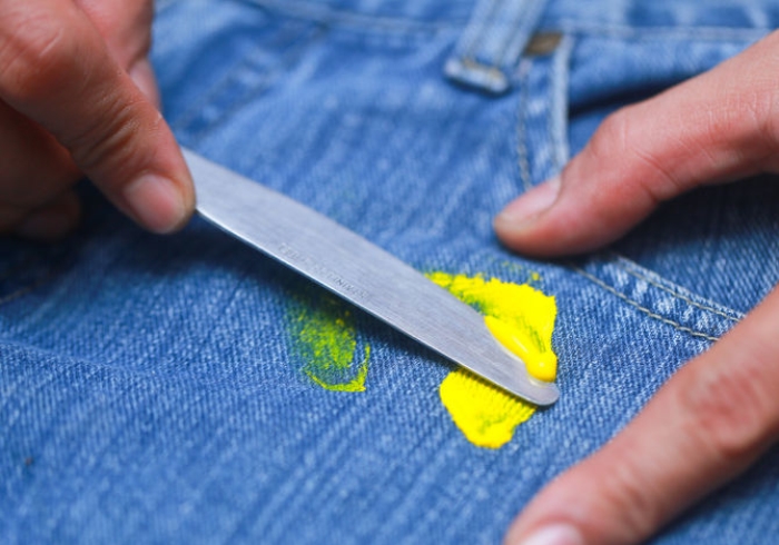 Якщо фарба ще не засохла, її потрібно постаратися максимально видалити з одягу механічним способом – за допомогою ножа чи пилки для нігтів. Потім залишки речовини можна спробувати вивести одним із доступних засобів, які є вдома у кожного.