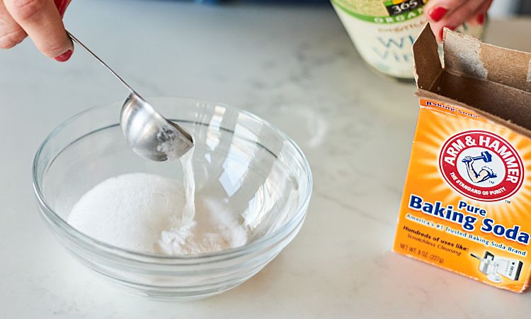 3. Готуємо спеціальну пасту із харчової соди: змішуємо у невеликій мисці 170 г порошку з 3 ст. л. води. Перемішуємо до утворення густої маси, якщо потрібно, кількість води можна збільшити.